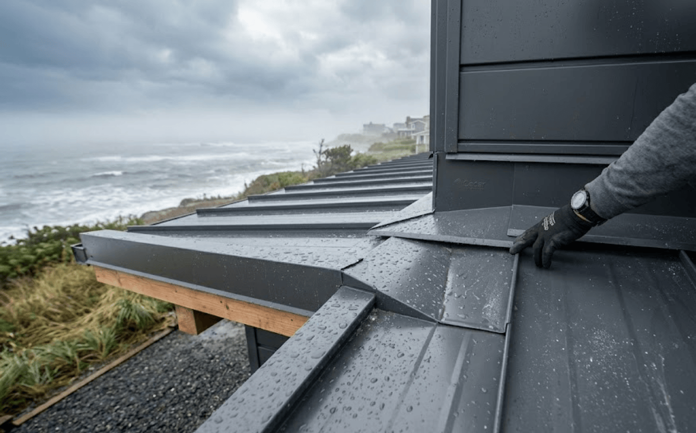 Coastal winds push water into areas it wouldn’t normally reach. This increases the importance of tight seams and properly designed metal transitions.